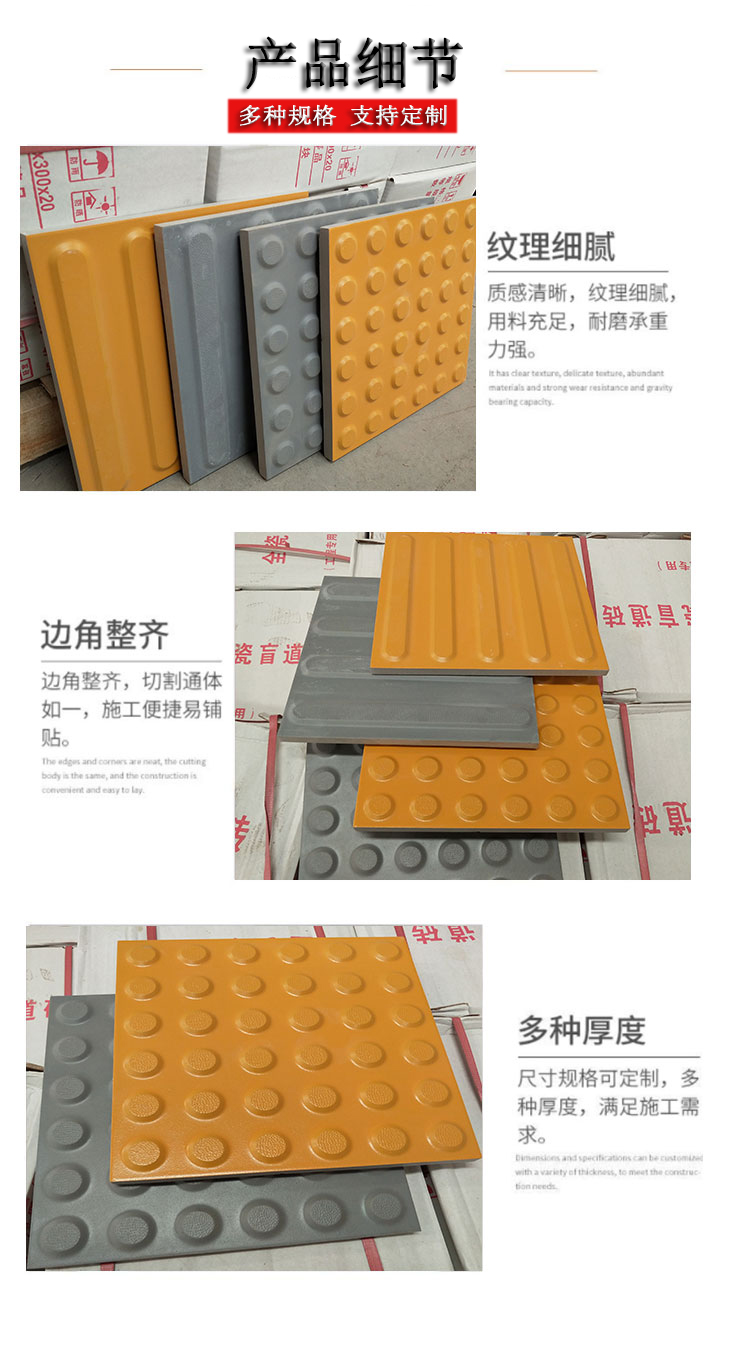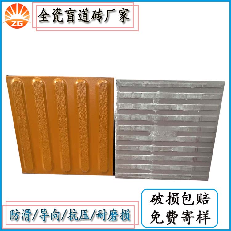 描述:全瓷盲道磚可分為兩種類型: 1:直條狀凸起磚,用于鋪直道,直條突起指向盲道方向,也就是走的時(shí)候沿著直條突起走。每條高出地面5mm,寬度宜為0.3-0.6m,可使盲杖和腳底產(chǎn)生感覺(jué),便于指引視力殘疾者...